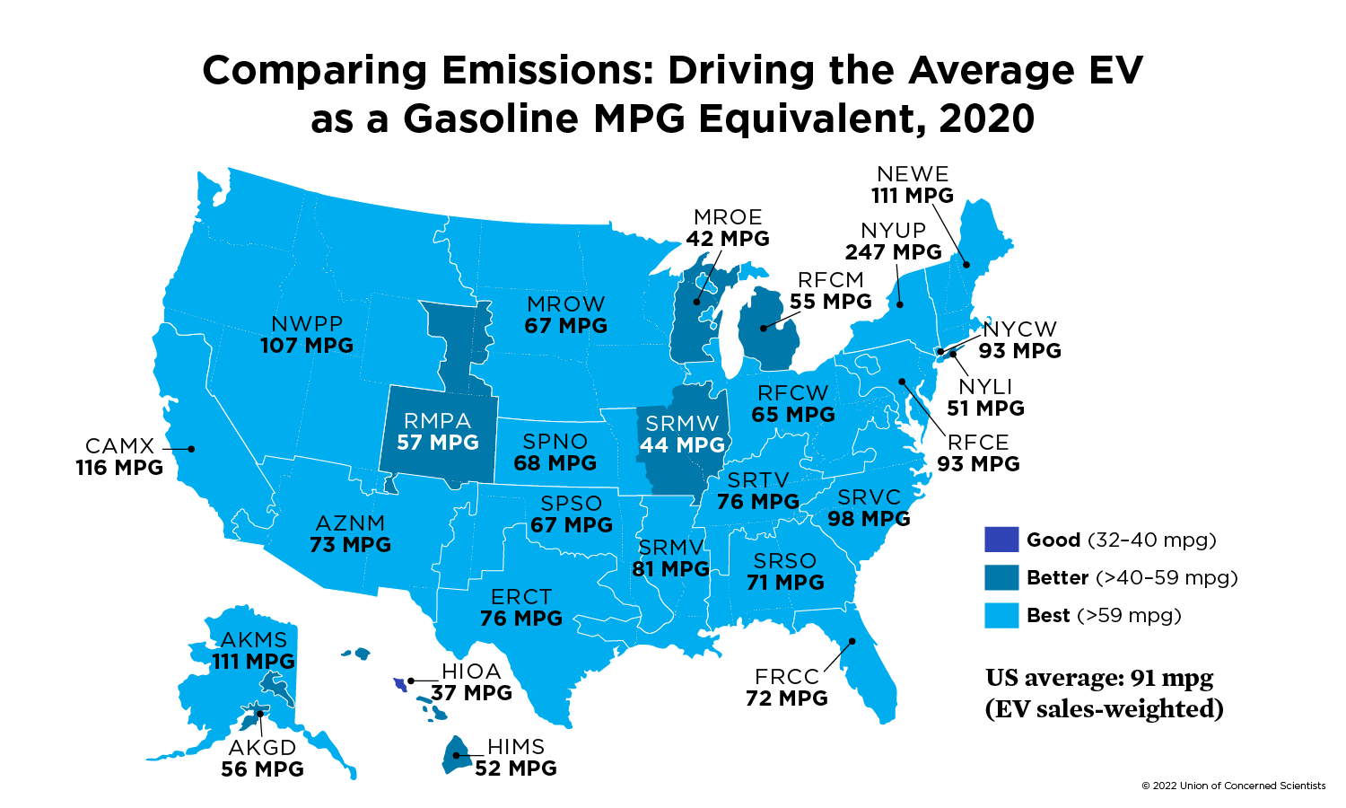 The MPGe standard doesn't account for how electricity gets generated. It's true that some of an EV's environmental advantage gets offset when fossil fuels are used in the electric mix. But even then, a reasonably efficient EV already emits far less CO2 into the atmosphere per mile driven than a reasonably efficient gas vehicle. It almost always beats a Prius hybrid, too. That's largely because the electric grid in many parts of the US is already cleaner than many people realize. Coal in particular is a rapidly shrinking part of the pie, while clean nuclear and renewable energy make up large chunks of the mix in several parts of the country. In the Northeast and along the West Coast, EVs have an especially huge environmental advantage.